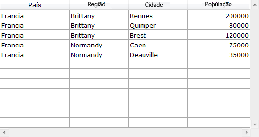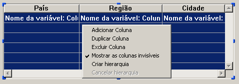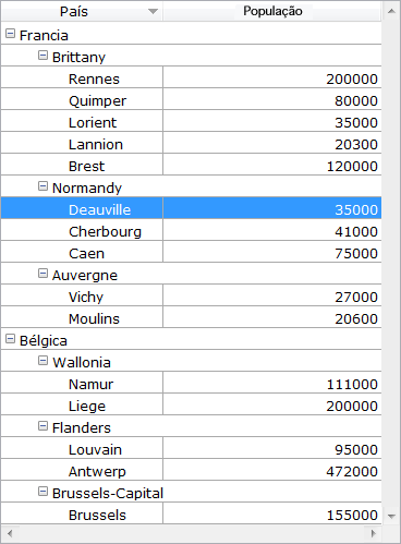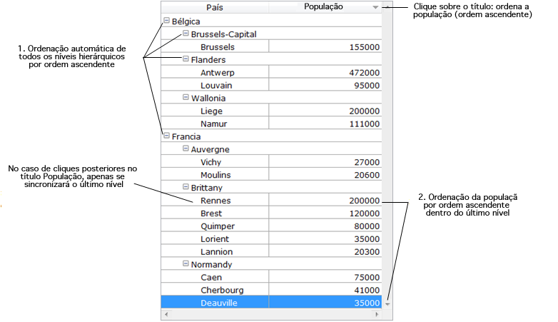 Exemplo: dado um list box cujas primeiras colunas contém País, Região, Cidade e População. Quando País, Região E Cidade estão selecionados (veja a imagem acima), se você escolher Criar hierarquia no menu contextual, uma hierarquia de três níveis é criada na primeira coluna, as colunas 2 e 3 são elimina das e a coluna População se converte na segunda: