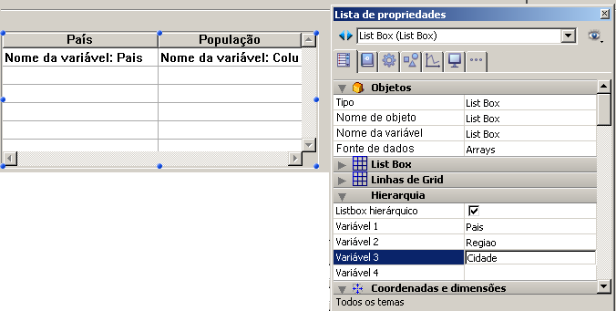 Uma linha de ruptura e um "nodo" hierárquico são agreagadas automaticamente ao list box quando os valores se repetem nos arrays. Por exemplo, imagine um list box que contém quatro arrays especificando as cidades, cada cidade é caracterizada pelo seu país, sua região, seu nome e seu número de habitantes: