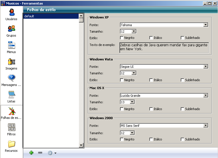 4. Na área de definição da folha de estilo, selecione a fonte, tamanho e opções de estilo que você quer para cada plataforma de execução do banco.