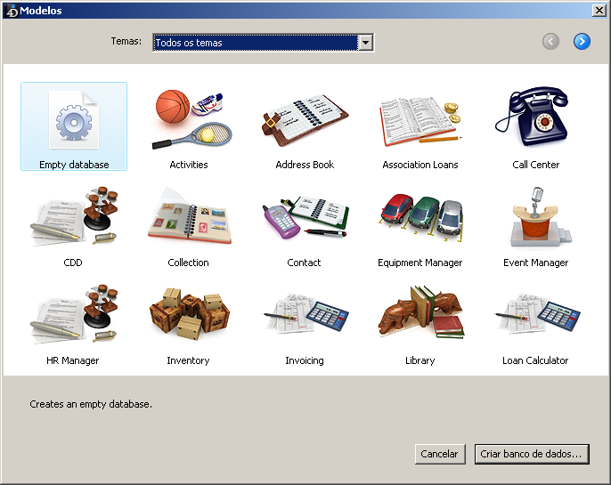 Nota: Os modelos de banco de dados são armazenados em uma pasta chamada “4D Modelos” ou “4D Templates”. Esta pasta deve estar no mesmo nível que o arquivo .exe da aplicaçao 4D (sob Windows) ou que o pacote (sob Mac OS), Se esta pasta estiver faltando, é aberta uma janela vazia. - Selecione um modelo dos temas que são oferecidos e clique em Criar banco de dados. Aparece uma caixa de diálogo que guarda arquivos de maneira que seja possível escolher o nome e localização do banco 4D.