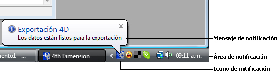 En titulo y texto, pase el título y el texto del mensaje a mostrar (en el ejemplo anterior, el título es “Exportación 4D”). Puede introducir hasta 255 caracteres.