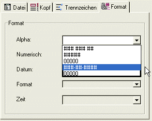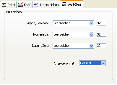 Für folgende Datentypen können Sie Füllzeichen verwenden: Alpha/Boolean (Felder vom Typ Boolean werden als Alpha importiert), Numerisch und Datum/Zeit. Das Leerzeichen dient normalerweise zum Füllen von festen Formatfeldern. Die DropDown Menüs bieten weitere Werte an. Im Eingabebereich rechts daneben erscheinen die ausgewählten Zeichen. Wollen Sie eigene Zeichen einsetzen, geben Sie diese direkt im jeweiligen Eingabebereich ein.
