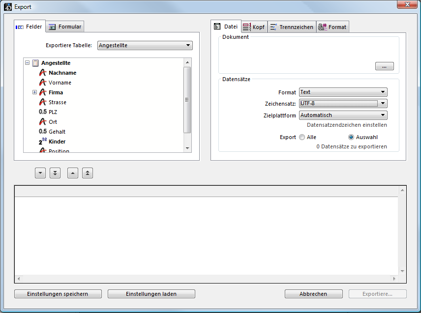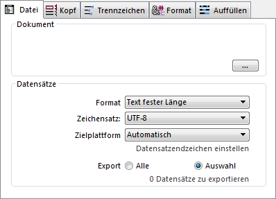 Wählen Sie im rechten Teil unter Datensätze das Format für die Exportdatei aus — Text, Text feste Länge, DIFF, SYLK, DBF, 4D oder XML und Formatierungsoptionen (siehe Abschnitt Dateiformate).