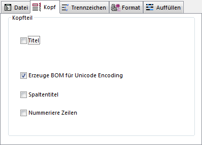 Erzeuge BOM für Unicode Encoding: Fügt eine Byte Order Mark (BOM) in den Kopfteil der Exportdatei ein. Diese zusätzliche Information erleichtert die Interpretation von Text durch die Import-Software, sofern sie diese Funktion unterstützt. Diese Option ist standardmäßig markiert. Sie wird jedoch nur berücksichtigt, wenn für den Export der Zeichensatz Unicode ausgewählt ist. Andernfalls wird keine BOM hinzugefügt.