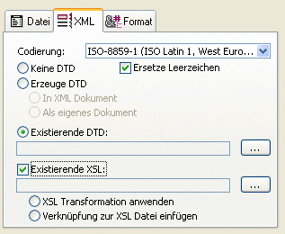 Erzeuge DTDin XML Dokument: Diese Option erzeugt während dem Export ein DTD, das direkt in die XML Datei eingebunden wird (interne DTD). Die generierte XML Datei ist demnach unabhängig.