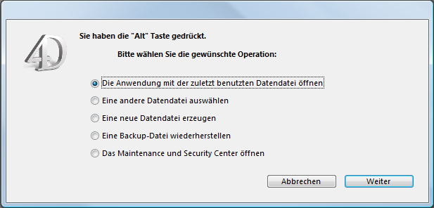 In allen Fällen können Sie eine vorhandene Datendatei öffnen oder eine neue erstellen. Bei einer neuen Datendatei öffnet 4D die Datenbank mit der ursprünglichen Struktur, jedoch ohne Datensätze.