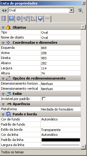 Todos os objetos em um formulário têm propriedades para definir sua aparência, sua visualização, e seu redimensionamento no modo Aplicação. Essas propriedades estão disponíveis usando a Lista de propriedades (ver a seção Editor de formulários).