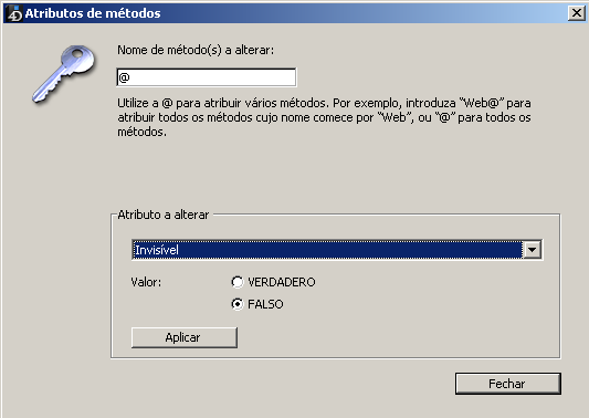 A caixa de diálogo "Atributos dos métodos", permite modificar um atributo de método projeto (Invisível, Oferecido como serviço web, etc) para todos ou alguns dos métodos de projeto do banco de dados em somente uma operação. Esta função é especialmente últil para modificar os atributos de um grande número de métodos de projeto. Da mesma forma é possível utilizar durante o desenvolvimento para aplicar atributos comuns a grupos homogêneos de métodos.