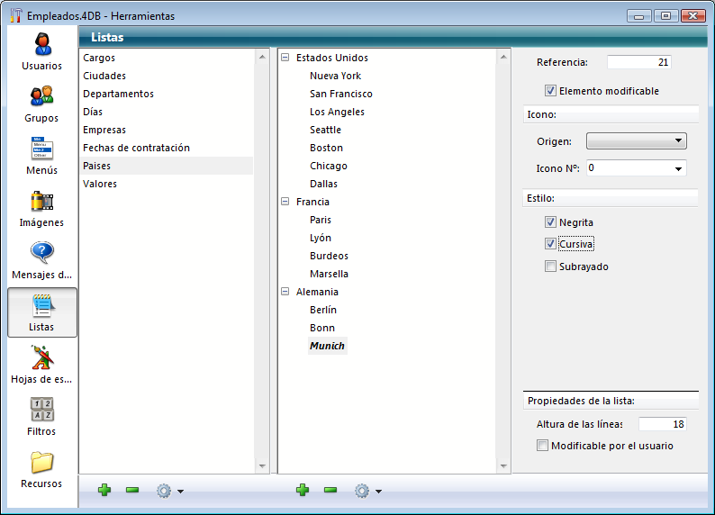 4D le permite especificar si una lista de elementos puede ser modificada por el usuario cuando la lista se muestra como una lista de opción. Por defecto, una lista no es modificable.