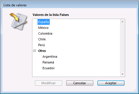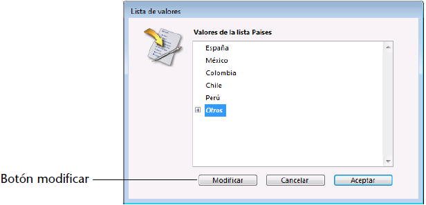 Si una lista es modificable, el botón Modificar está activo en la caja de diálogo de lista cuando utilice la base.