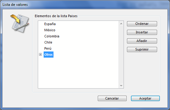 Marque la opción Modificable por el usuario en el área “Propiedades de la lista”: La lista puede ser modificada por los usuarios de la base.