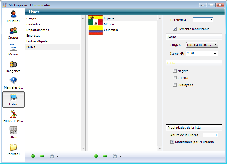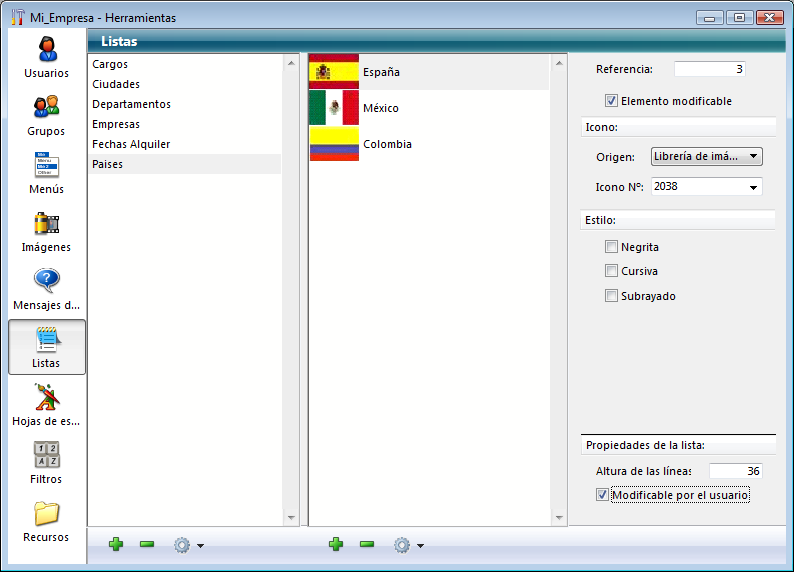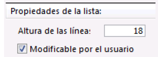 Para evitar que el usuario modifique una lista, seleccione la lista y deseleccione la opción Modificable por el usuario.