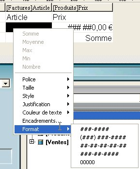 Le contenu du sous-menu varie en fonction du type de données contenu dans la colonne : numérique, alpha, date, heure ou image. Si la colonne de l’état contient des données que vous ne pouvez pas formater, la commande de formatage est inactivée.