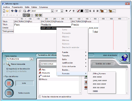 Se pueden aplicar diferentes formatos a las diferentes columnas del informe.