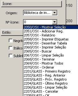 Escolha uma opção do menu Origem da área Ícone. Este menu permite indicar a fonte do ícone (a opção recomendada é a Biblioteca de Imagens). Ao escolher uma opção, o conteúdo do menu Nº ícone é atualizado para listar todas as imagens disponíveis no banco de dados que correspondem ao tipo definido no menu Origem.