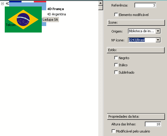 Escolha um valor do combo box Nº ícone. Os ícones são listados sob a forma número/nome. Se você escolheu a opção "Biblioteca de Imagens", o menu Nº ícone contém todas as imagens armazenadas na biblioteca. O ícone é adicionado a esquerda da etiqueta na lista de elementos: