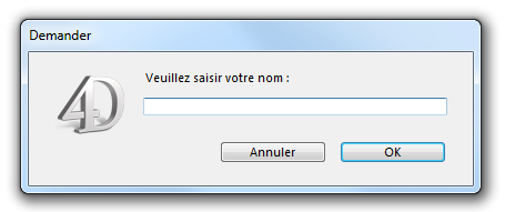 Conseil : Si vous voulez récupérer plusieurs informations de l'utilisateur, construisez un formulaire approprié et appelez-le avec la commande DIALOGUE, plutôt que d'afficher une succession de boîtes de dialogue du type Demander.