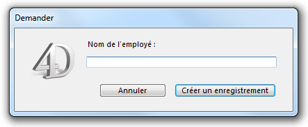 $vsAffiche:=Demander("Nom de l'employé :";"";"Créer un enregistrement";"Annuler")