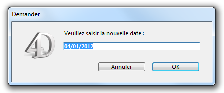 $vdAffiche:=Date(Demander("Veuillez saisir la nouvelle date :";Chaine(Date du jour)))... provoquera l'affichage de la boîte de dialogue suivante :