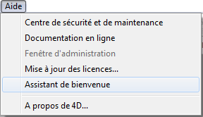 Par défaut, l’assistant est affiché à chaque démarrage. Vous pouvez le masquer en cochant l’option Ne plus afficher ce dialogue au lancement de 4D. Vous pourrez à tout moment l’afficher de nouveau en sélectionnant la commande Assistant de bienvenue dans le menu Aide :