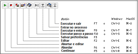 Nove botões estão localizados na barra de controle de execução na parte superior da janela Debugger: