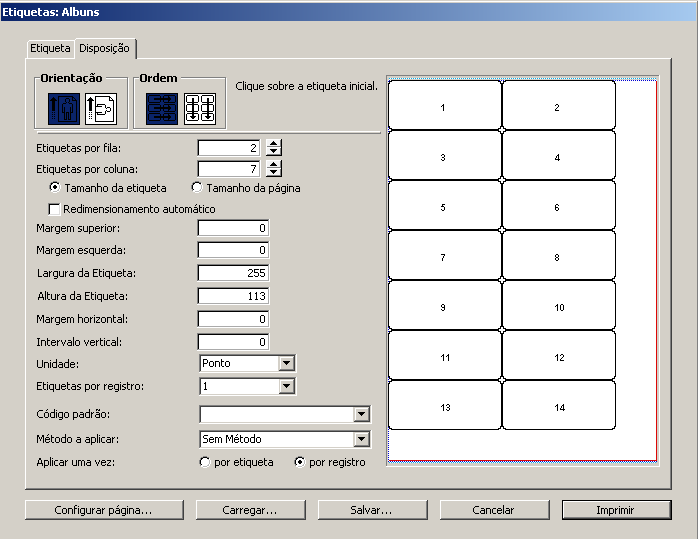 Botões Orientação e Ordem: estes botões lhe permitem especificar a orientação da página e a ordem em que a informação deve ser atribuída nas etiquetas. Lembre-se que a orientação da folha é independente da orientação da página. Se você modificar este parâmetro, tenha certeza de alterar a configuração da página de acordo com a caixa de diálogo de configuração da impressora