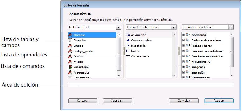 El editor de fórmulas le ofrece muchas formas de escribir fácilmente sus instrucciones. Puede hacer clic en el nombre de los campos, operadores y comandos, así como también en métodos de proyectos, para añadirlos a la fórmula. Cuando hace clic en un elemento, se muestra automáticamente en el área de edición donde puede modificarlo utilizando las funciones estándar cortar/copiar/pegar. También puede introducir directamente los elementos en el área de edición o arrastrarlos y soltarlos desde la lista de elementos.