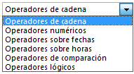 Nota: las tablas y campos con la propiedad invisible no aparecen en la lista. Para mayor información sobre esta propiedad, consulte el párrafo “Atributos” en las secciones Propiedades de las tablas y UNREGISTER CLIENT. - Lista de operadores: la lista de operadores le permite seleccionar los operadores a utilizar en la fórmula. Los operadores están agrupados en temas en el menú ubicado sobre la lista: