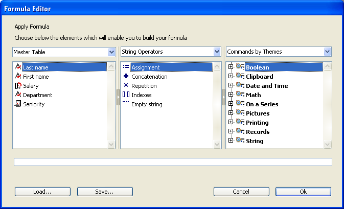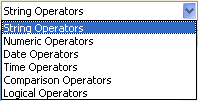 注: 非表示設定されたテーブルやフィールドはリストに表示されません。テーブルやフィールドの非表示設定に関する説明は、テーブルプロパティおよびUNREGISTER CLIENTの"属性"項目を参照してください。 - 演算子リスト: 演算子リストを使用すると、フォーミュラで使用する演算子を選択することができます。演算子は、リストの上のメニューに表示されるテーマ別に分類されています: