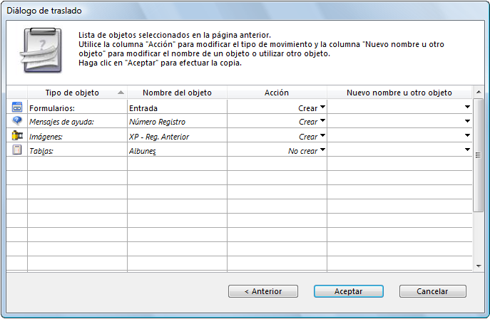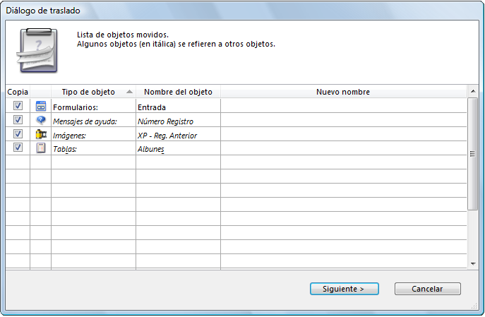 La columna “Nuevo nombre u otro objeto” muestra el nombre que se le dará al objeto una vez se copie en la base de destino. Puede cambiar este nombre (tenga cuidado de no utilizar un nombre que ya exista en la base de destino, esto crearía un nuevo conflicto de nombre). En el caso de objetos dependientes, esta columna permite igualmente designar otro objeto de la base de destino (cuando la acción Utilizar otro objeto está seleccionada). Por ejemplo, en el caso del desplazamiento de un formulario tabla, puede designar una tabla de la base de destino como la tabla a la cual pertenecerá en lugar de crear la tabla.