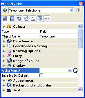 デフォルトでプロパティリストの"表示"エリアで文字フォーマットが利用可能です。このリストからフォーマットを選択するか、コンボボックスにタイプすることができます。フォーマットポップアップメニューには主に使用される文字フォーマット (電話番号等) が用意されています。またツールボックスのフィルターとフォーマットで設定したカスタムフォーマットを選択することもできます。この場合そのフォーマットをオブジェクトプロパティで変更することはできません。フォーマットコンボボックスの右にある[...]ボタンをクリックすると、フォーマットエディターにアクセスできます。