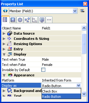 フィールドプロパティでブールフィールドの表示形式とラベルを指定できます。ボタンやチェックボックスだけを表示し、ラベルは表示したくない場合は、フォーム中のフィールドラベルを削除します。