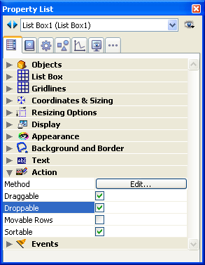 あるオブジェクトから別のオブジェクトにドラッグ&ドロップを実行するには、プロパティリストウインドウでそのオブジェクト用のドラッグ可 プロパティを選択する必要があります。ドラッグ&ドロップ処理では、ドラッグされるオブジェクトがソースオブジェクト になります。