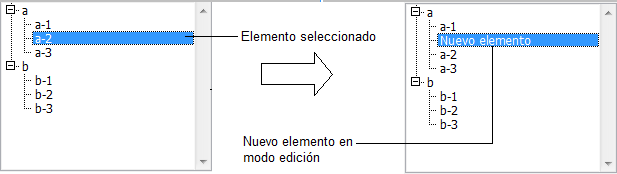 El siguiente código puede ser el método de un botón que le permite insertar un nuevo elemento en una lista existente. El texto por defecto “Nuevo_elemento” está listo automáticamente para ser cambiado: