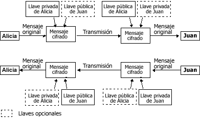 Principio de cifrado con llaves públicas y privadas para el intercambio de mensajes entre dos personas, “Alicia” y “Juan”: