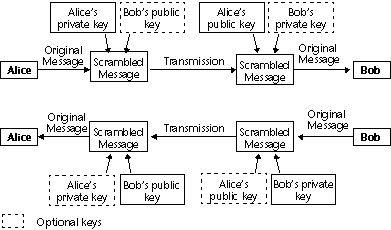 “Alice”と“Bob”の間で行われるメッセージ交換のための、公開及び秘密鍵を使用した暗号化の原則