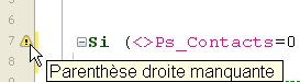 4D vérifie automatiquement la syntaxe de la méthode. Si vous saisissez ou sélectionnez du texte qui ne respecte pas la syntaxe, 4D désigne l’expression incorrecte à l'aide du symbole