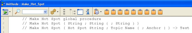 Note : Vous pouvez utiliser les signets comme marqueurs des lignes contenant un élément trouvé par une recherche. Dans ce cas, 4D ajoute automatiquement les signets. Pour plus d'informations, reportez-vous à la section Rechercher et remplacer dans les méthodes.