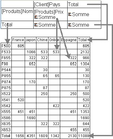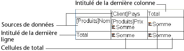 Sources de données : ces deux cellules contiennent les champs utilisés pour les deux catégories du tableau croisé. La cellule centrale, située à l’intersection de ces deux cellules, peut également accueillir une référence de champs et des calculs.