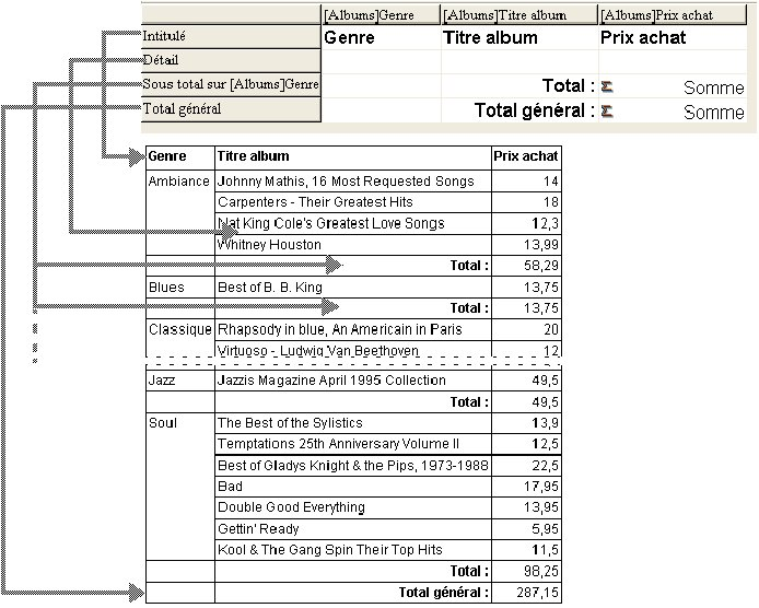 Lignes de rupture : ces lignes affichent des calculs intermédiaires ainsi que les libellés qui leur sont associés. Une ligne est créée pour chaque ordre de tri.