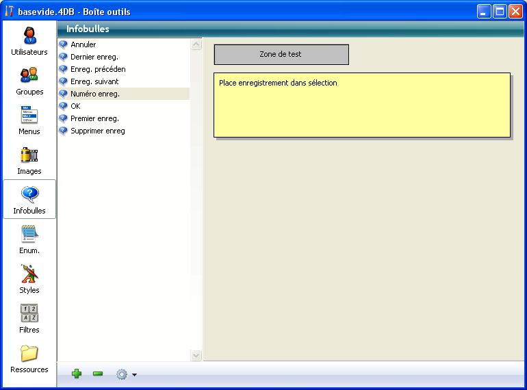 L'éditeur d'infobulles vous permet de créer et de tester des infobulles que vous pourrez ensuite associer aux objets de la base.