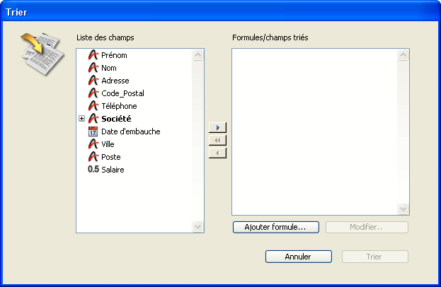 - Boutons Ajouter formule... et Modifier... : ces boutons vous permettent d’écrire ou de modifier des formules utilisées comme critères de tri. Vous utilisez une formule de tri lorsque vous voulez effectuer un tri sur autre chose qu’un champ, comme une variable calculée ou une partie seulement d’un champ. Par exemple, vous pouvez trier les enregistrements par rapport au calcul du taux de rejet des pièces détachées ou par rapport aux quatre derniers chiffres d’un champ Numéro de pièce.