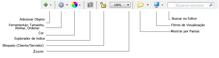 O editor de estrutura dispõe de uma barra de ferramentas que contém funções como a adição de objetos, como também opções de navegação e visualização: