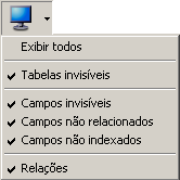 • Se você adicionar um objeto cujo tipo não está exibido (tabela, campo ou relação), o objeto é exibido no editor, e se deseja escondê-lo deve novamente selecionar a opção correspondente no menu associado com o botão Exibir.