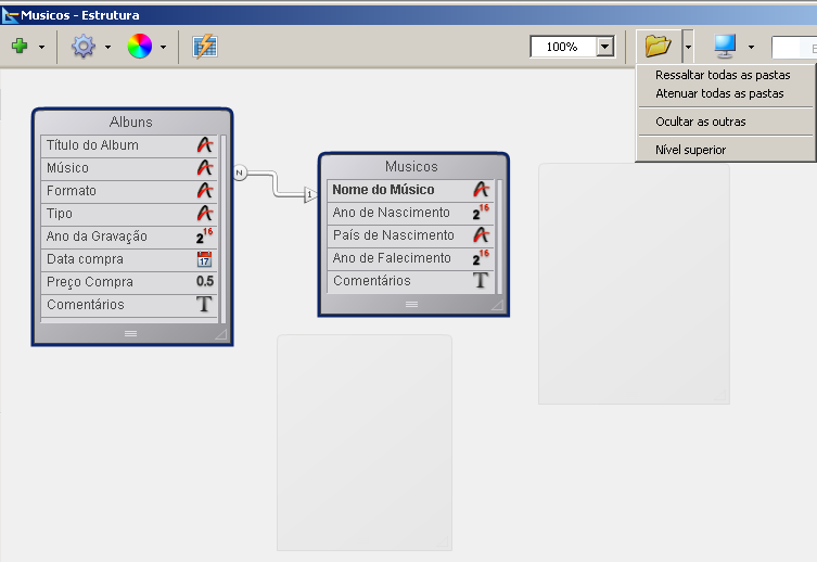 Os comandos Ressaltar todas as pastas/Atenuar todas as pastas permitem mostrar/ocultar todas as tabelas das pastas do banco de dados.