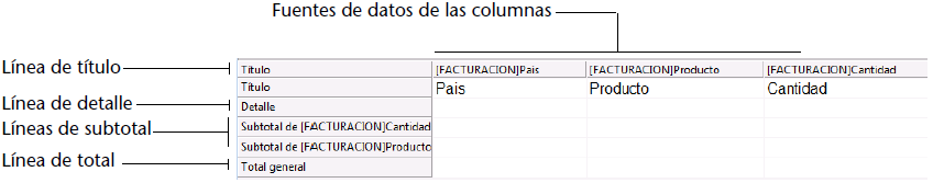 Fuentes de datos de columnas: estos títulos indican la fuente de datos de cada columna. Modo tabla cruzada: