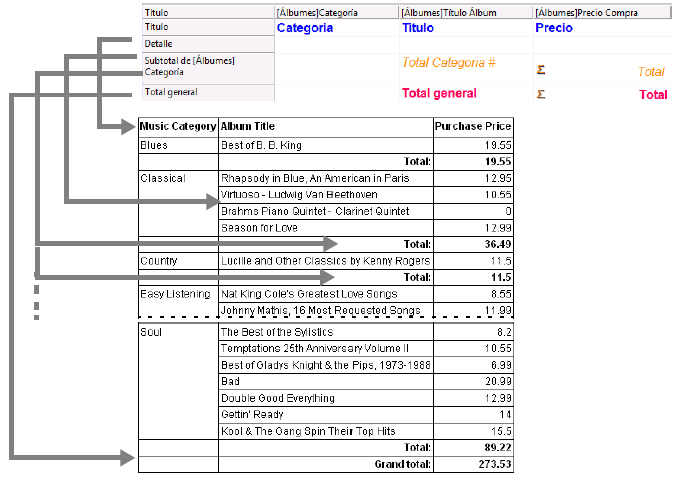 Las siguientes imágenes muestran diseños de informes rápidos la relación entre las especificaciones de diseño y la salida impresa: