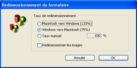 La boîte de dialogue "Redimensionnement du formulaire" permet de redimensionner les objets du formulaire afin que leur échelle corresponde à la plate-forme utilisée.