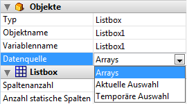 Hinweis: Bei Listboxen vom Typ Array lassen sich Stil, Farbe für Schrift oder Hintergrund und Sichtbarkeit für jede Zeile getrennt angeben. Dies wird über Arrays verwaltet, die der Listbox in der Eigenschaftenliste zugewiesen werden. Über den Befehl LISTBOX GET ARRAYS können Sie die Namen dieser Arrays per Programmierung herausfinden.