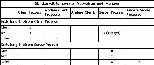 Nachfolgende Tabelle zeigt, wie temporäre Auswahlen sichtbar sind, je nachdem, wo sie erstellt wurden: